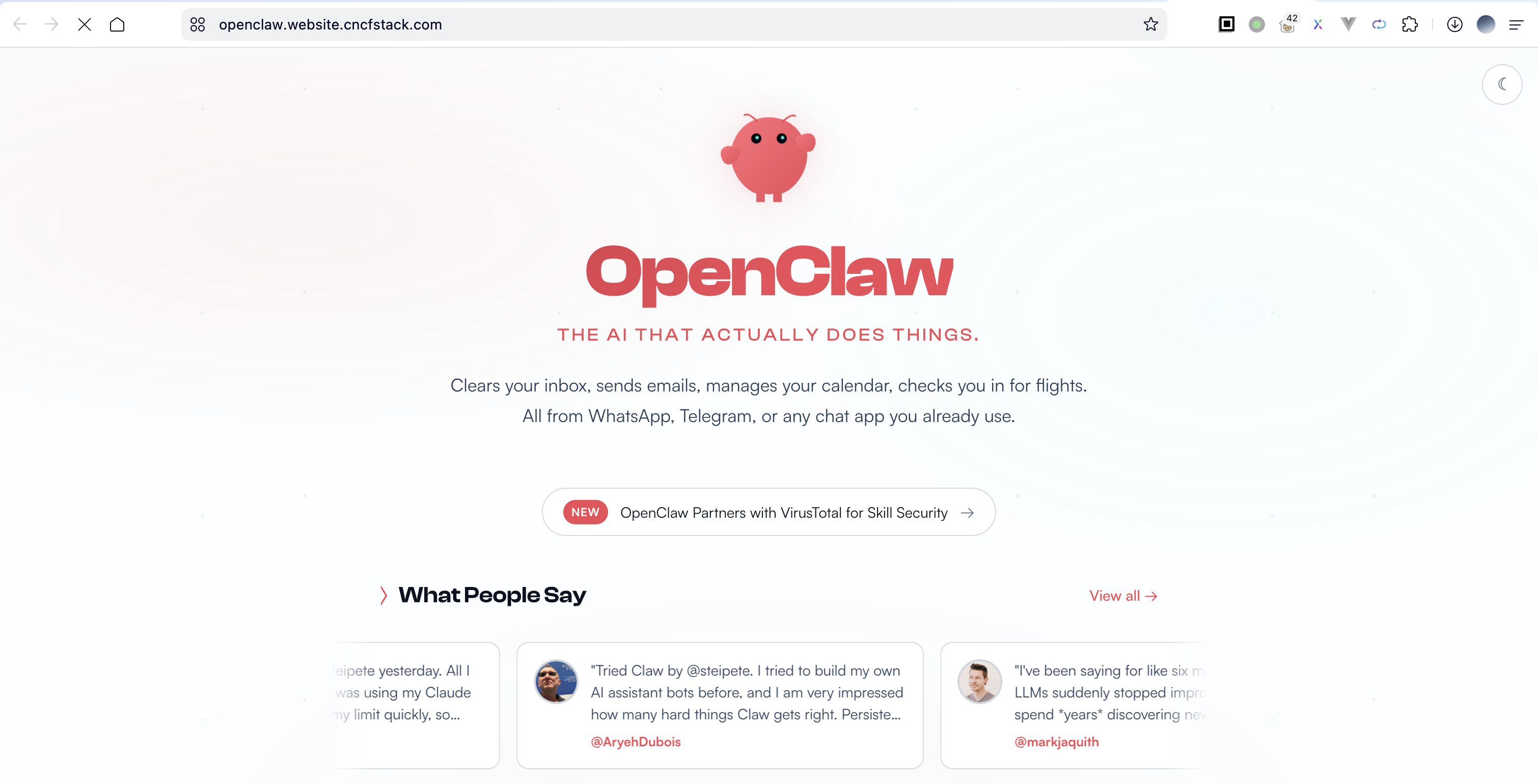 提供OpenClaw官方站点 https://openclaw.ai 和 官方文档 https://docs.openclaw.ai 的镜像站,提供 CDN 加速,且每天定时同步,保持官网最新。