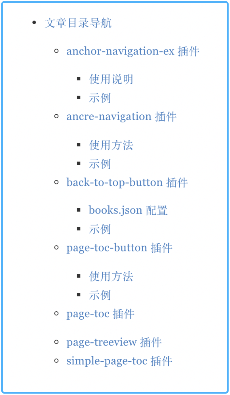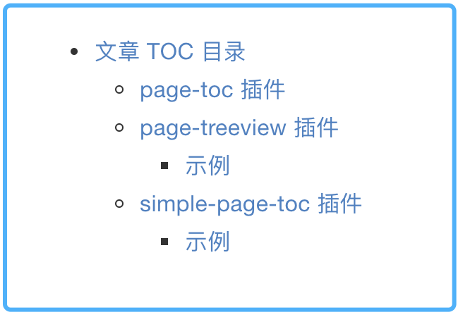 生成本页目录 需要在文章中插入标签,支持1-3级目录 页面顶端生成。另外 GitBook 在处理重复的标题时有些问题,所以尽量不适用重复的标题。