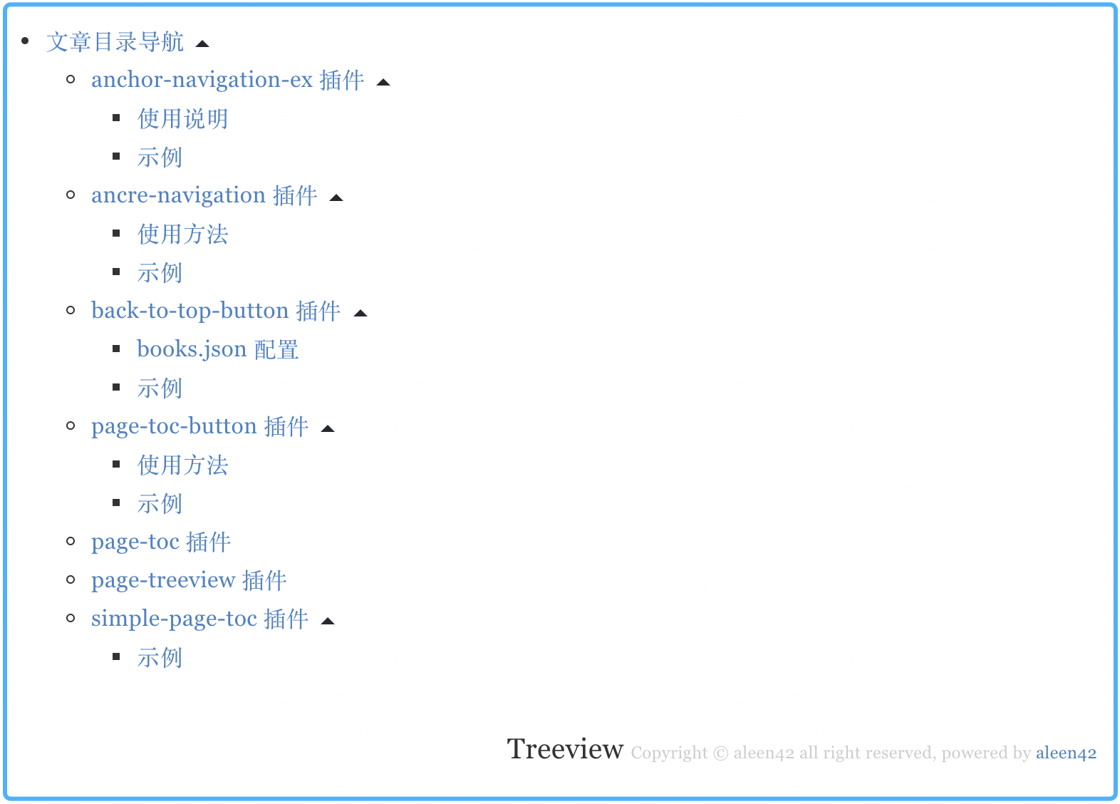 这个插件生成目录以后,下面有一行关于版权的文字。如果想去掉的话,找到插件目录下的index.js文件:***/node_modules/gitbook-plugin-page-treeview/lib/index.js 找到如下这段代码