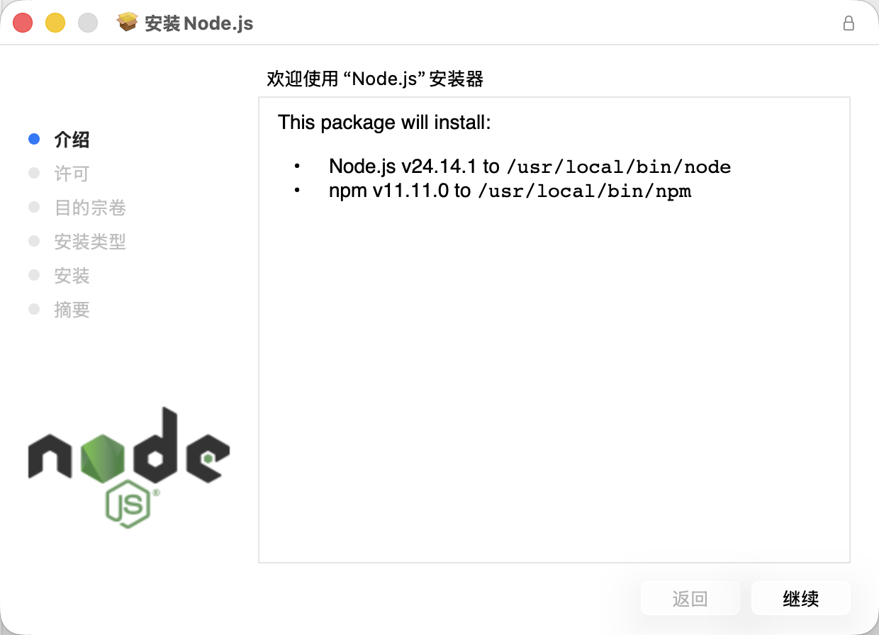 双击下载的 pkg 安装包,全程按照默认“继续”进行安装即可
