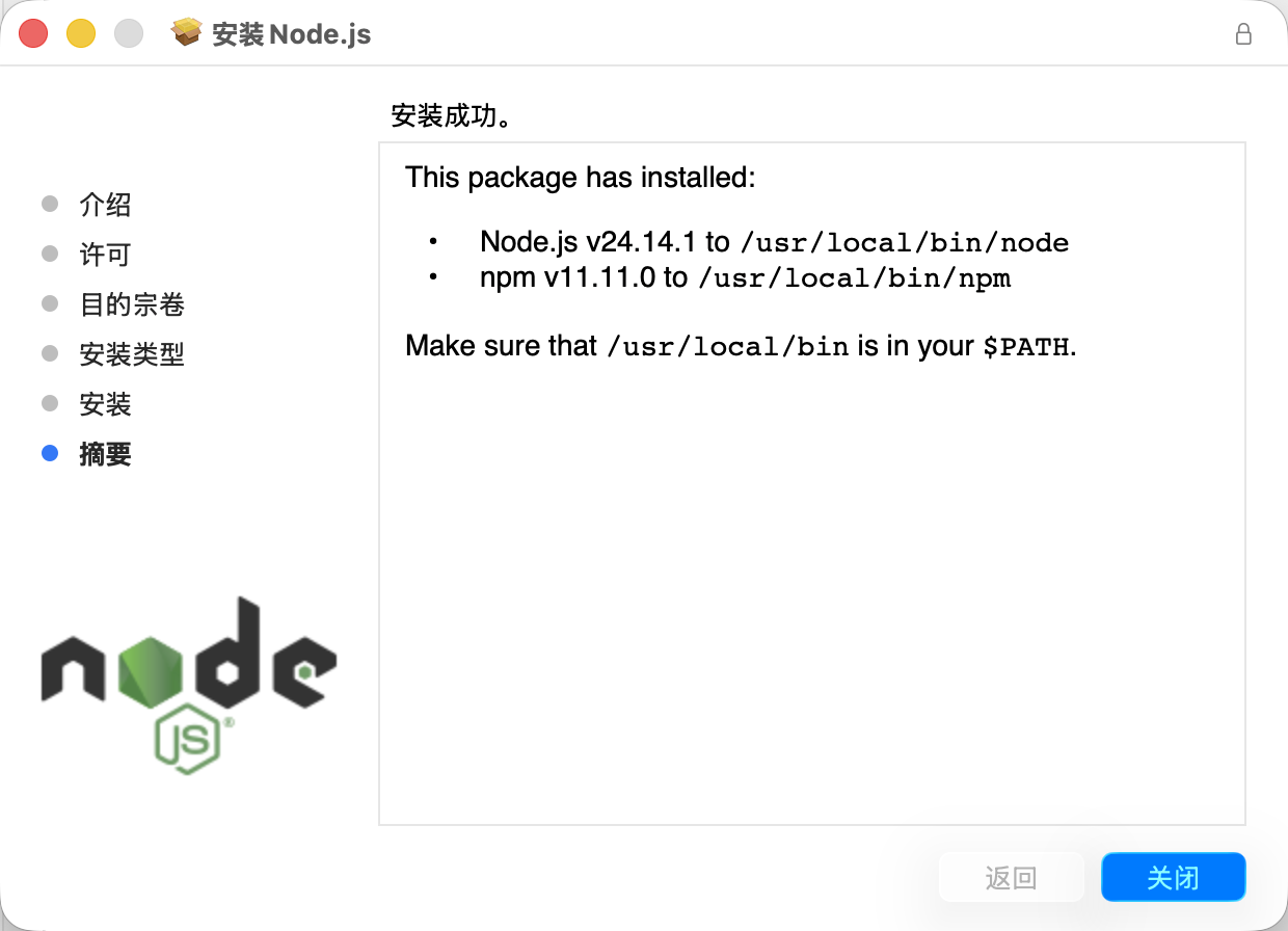默认安装路径为 /usr/local/bin/node 和 /usr/local/bin/npm 这个路径在 macOS 上是一般是添加到环境变量的,默认安装成功后就可以直接使用命令node和npm进行操作了。