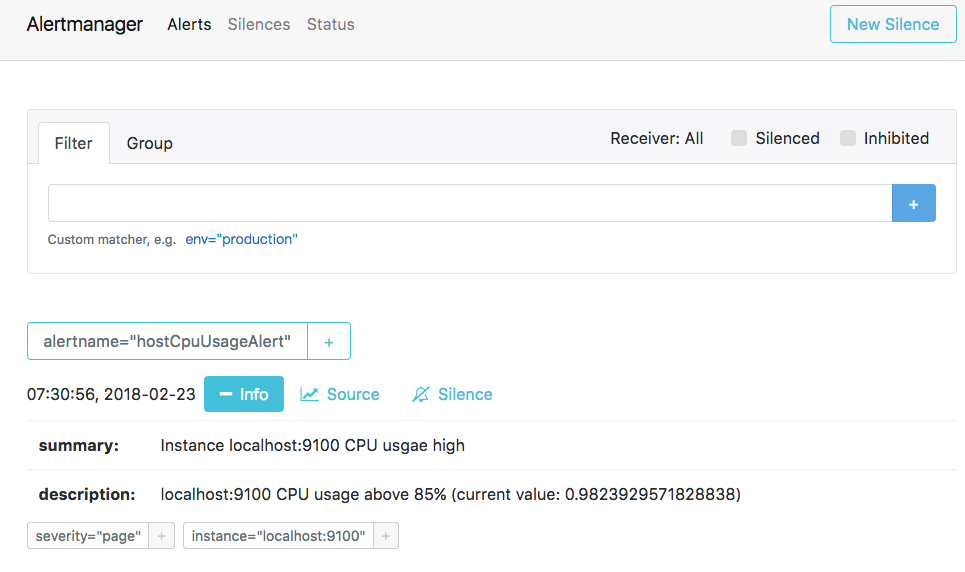 查看Alertmanager UI此时可以看到Alertmanager接收到的告警信息。